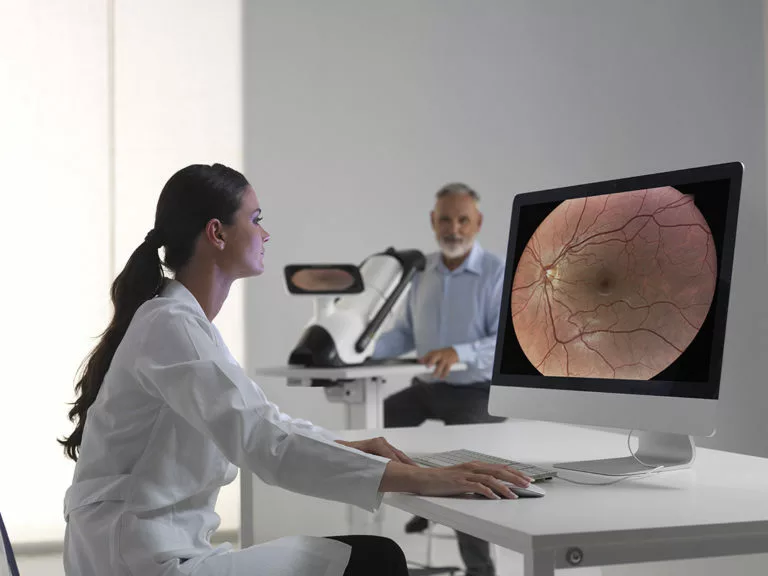 Nemydriatická plně automatická kamera která ve spojení s AI umožní screeningové vyšetření na AMD, DR a Glaukom on-line Rychlé, efektivní a plně automatizované vyšetření